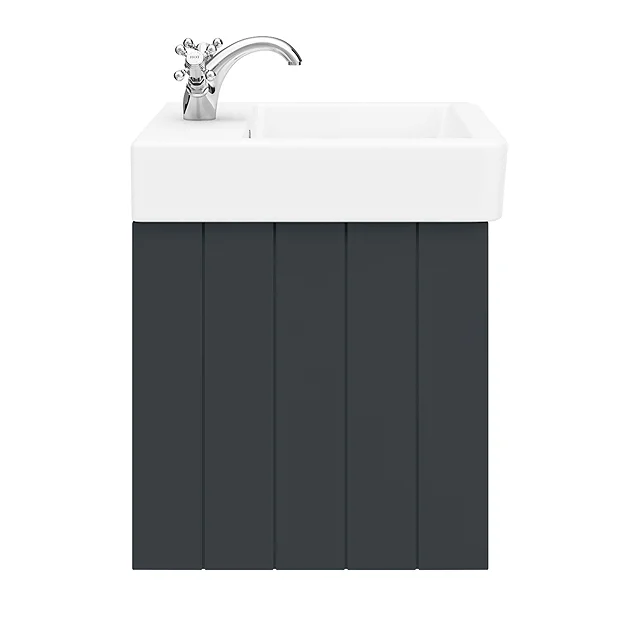 The Chatsworth traditional 560mm wide wall hung satin graphite vanity unit with gloss white ceramic basin, Victorian inspired design with a modern twist. The Chatsworth range of charming bathroom furniture features classic styling with a satin graphite finish cabinet and tongue-and-groove side panelling.