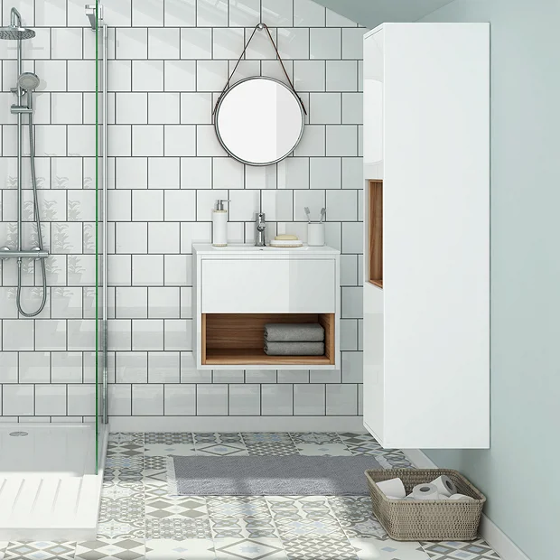 Combine the minimalist look and latest technology of push open doors with open shelves in the Haywood collection. The open shelves complement the fascia choice and provide immediate access to your bathroom necessities. The Haywood range is ideal for most sizes of bathroom and its unique design makes it the perfect choice for a style statement. This stylish wall mounted tall unit will create a focal point in the bathroom as the natural oak effect open shelf is a great complement to the gloss fascia.